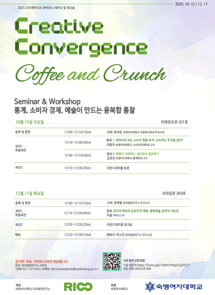 숙명여자대학교 창의융합연구소는 교내 구성원들의 학문적 교류와 소통의 장을 마련하고자 「Coffee & Crunch」를 개최합니다. 본 세미나는 점심 시간에 진행되며, 다과와 커피(또는 차)를 함께 나누며 교수님들의 연구를 소개받고 토론하는 자리입니다. 교수님뿐만 아니라 학부생·대학원생 모두 참여할 수 있으니 많은 관심과 참여를 바랍니다.